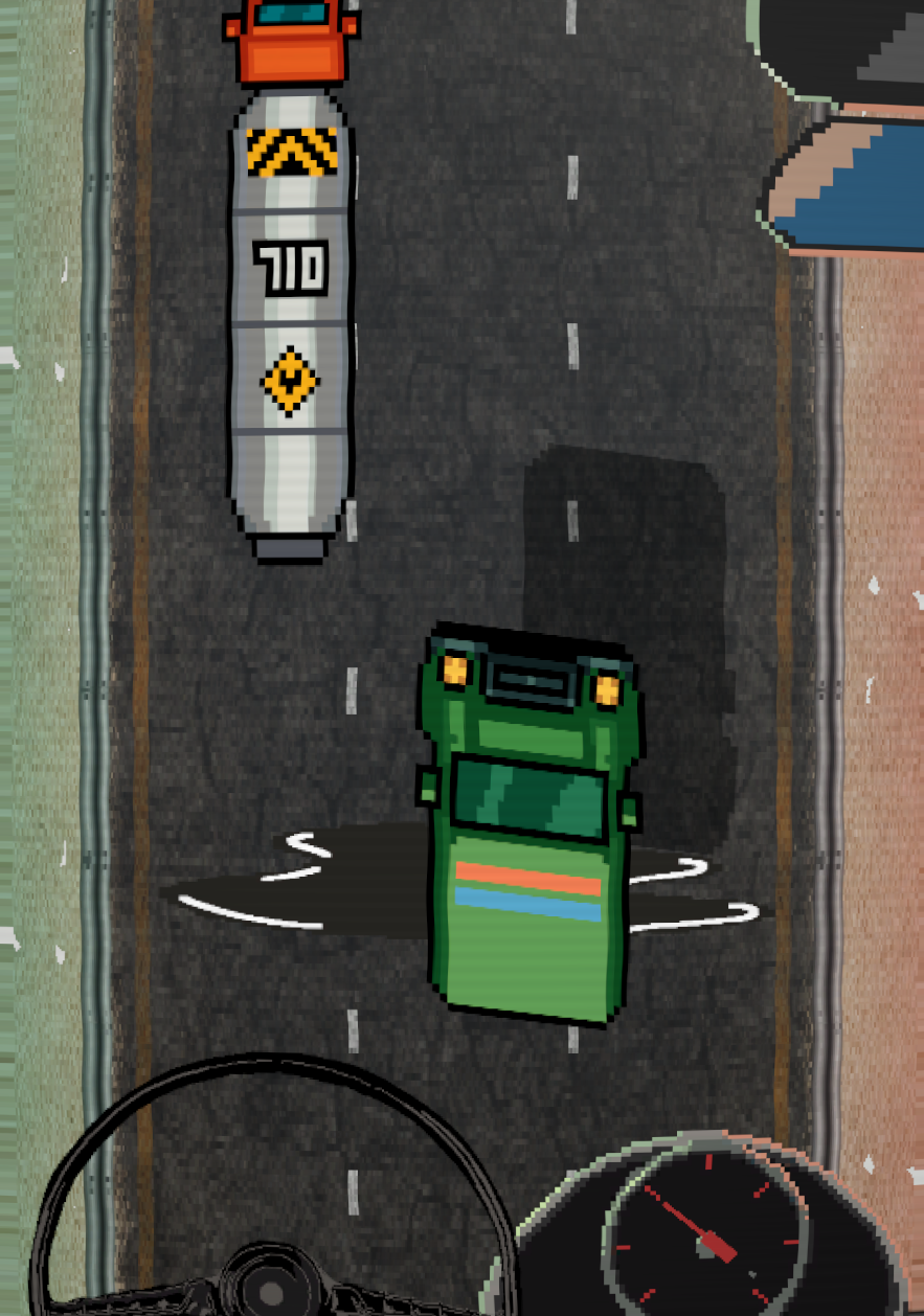 Encouraged by some positive playtesting feedback, I took this a step further with an animated steering wheel and speedometer at the bottom of the screen that rotate to reflect the player’s input. These small examples of feedback helped make a simple game feel alive, responsive, and exciting. I was empowered to accomplish this with the excellent work of my teammates, who quickly created high-quality pixel art assets for a rapidly changing game.